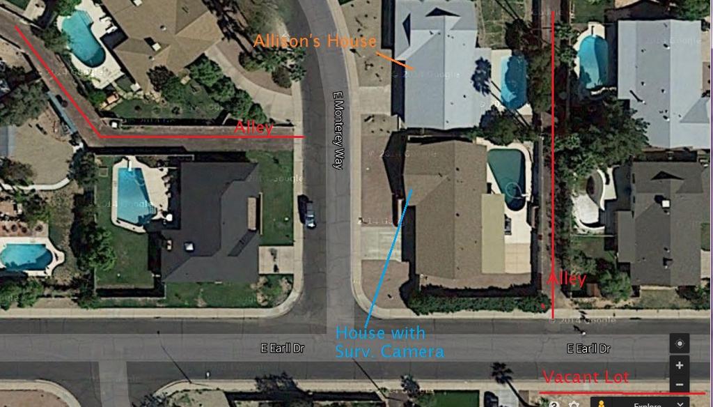 When you look down at the red lines, they are the alley's by Allison's house. I knew she had an alley directly behind her but when I went over there the other night, when it was so very dark, I couldn't see that there was another alley almost directly in front of her house. I spoke with some neighbors who were walking their dogs late at night and they told me that was the alley that LE had all the caution tape around. Maybe they had it in back too, I'm not sure, but I always thought the photo I had seen on the news looked different from that alley behind her house.