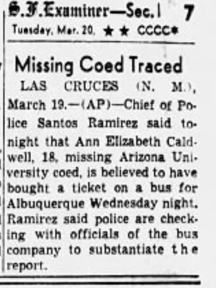 March 14, 1956: Ann buys a bus ticket to Albuquerque, New Mexico or El Paso, Texas.