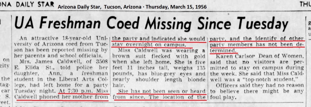 An article in the Arizona Daily Star, 30 Mar 1957, Sat · Page 2, stated she was located in Plainview, Texas. "Frank Miller, a warrant officer with the Plainview Police Department, said, "We belive that we have information on the girl's whereabouts and we don't want to say anything until we have talked to Miss Caldwell's parents." Miller would not disclose where the police believe Miss Caldwell was. "I can't say anything until we get the entire thing cleared up," he said. "We are just interested in letting her folks know where she is." Miss Caldwell's parents were unavailable for comment when the information was received from Texas.
