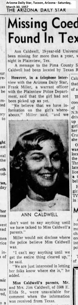 I agree, probably not Ann Caldwell from Arizona. We'll rule out Elizabeth Caldwell from Tennessee. It still doesn't negate all the other information about her. Miss Caldwell was found as of March 30, 1957 and had been located by the Texas Rangers. In a telephone interview with the Arizona Daily Star, Frank Miller, a warrant officer with the Plainview Police Department, said that the girl had not been picked up yet. Obviously, she was found in Plainview, Texas since a Plainview PD officer was handling the case. She was no longer missing from that point on. Again, this can no longer be classified as a missing person case. Based on that newspaper article alone. Good job, Texas Rangers!