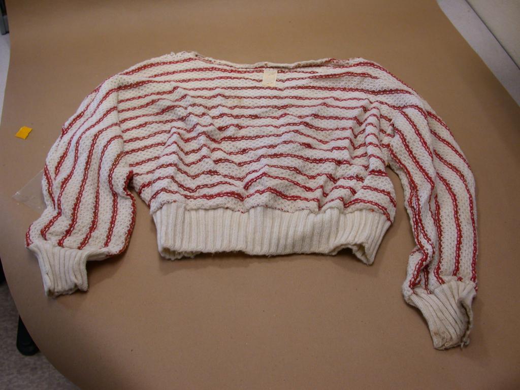 Valentine's Day may be more than the coincidental day she was discovered. The sweater is red and white - the traditional Valentine's Day colors - and there 14 stripes. Valentine's Day is February 14th. The sweater features could be a coincidence, or it may have been specifically designed to be sold prior to Valentine's Day, and it may have been a recent purchase.