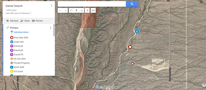 First, the sock location where he points out the pallet (and that it looks out of place) is just a short distance from the Well Site not the wreck site. Perhaps a half mile. My best guess is attached as where it was found. Brown X, well site Red Square.