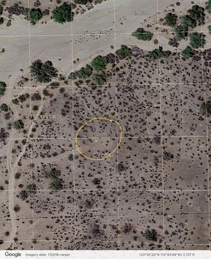 On Google Earth this white cross is not far from crash scene. It’s north toward Wagner Wash. Has anyone seen this out there? What is it?