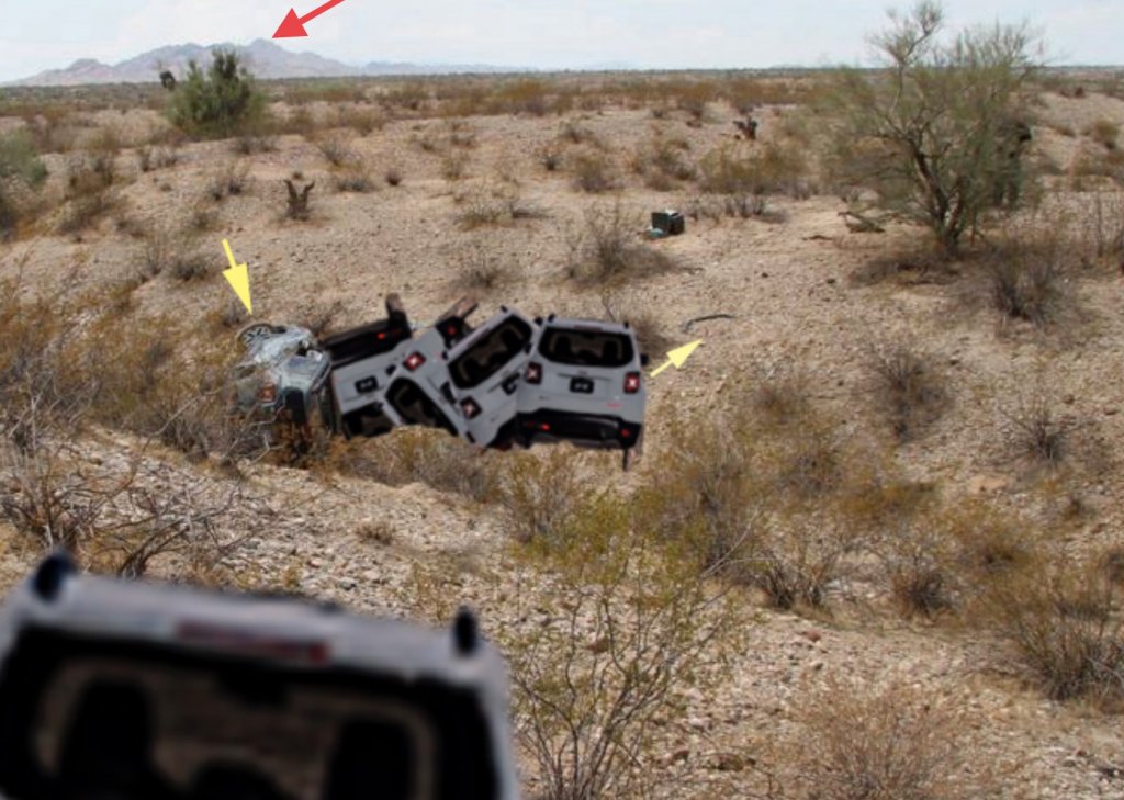 Attached is a still from JJRay’s crash scene video - I used the rollover simulation photo above as it gives a clearer view of the range/peak. Both are taken in line with the direction of DR’s travel immediately prior to going in to the ravine - approximately north-west. The JJRay video image is taken from roughly the spot where he believes the Jeep stopped briefly before taking off at speed and going into the ravine.View attachment 374201