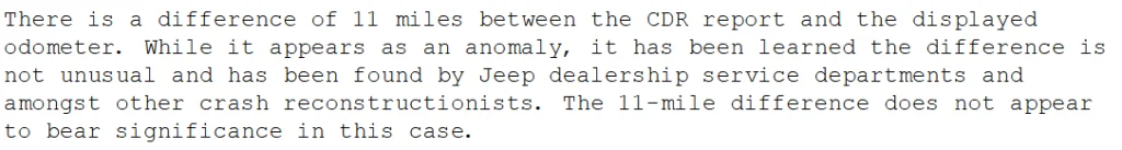 11 extra miles- The odometer shows 11 miles driven after the crash, which don’t appear in the crash data because they happened afterward. Jeep experts say this is normal because crashed vehicles often restart and move after airbags deploy. Daniel’s Jeep did the same.