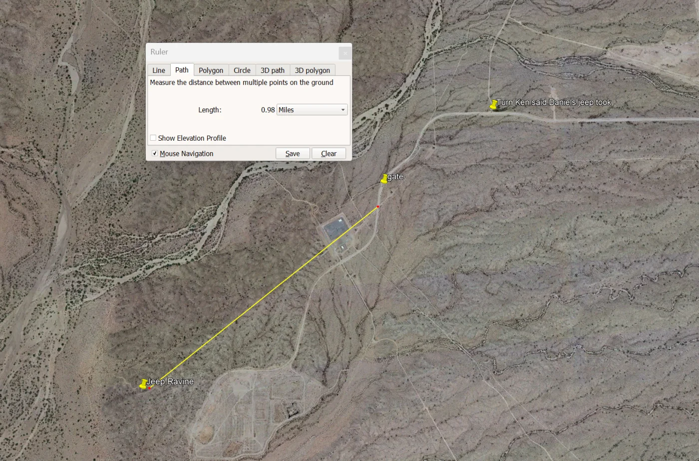 I need to clarify something I said earlier. I mentioned that Daniel’s Jeep was found about two miles from where it was last seen turning into the desert. That’s technically true, but it wasn’t the last point where Ken said he saw Daniel’s tracks.
