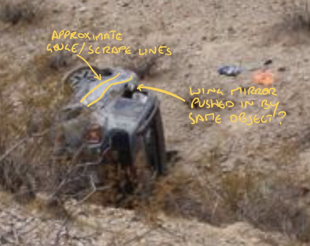 Tbh I’ve gone from thinking something like a crowbar/wrecking bar, to truck and now back towards wrecking bar/jack causing initial windscreen and pillar damage with other driver’s side damage resulting from a second incident (possibly collision with a transmission tower). Just to add re the driver’s side damage - to cause the ‘ride up’ along the driver’s side as a result of contact with a stationary object, my impression is that the Jeep would have needed to turn in towards it as it passed, suggestion deliberate intention (MOO).