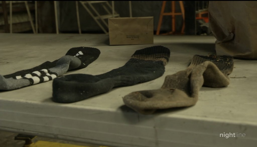 Still from ABC Nightline video of the three socks - presumably those found at the car location on the left and the faded one apparently found later near the pallet on the right.