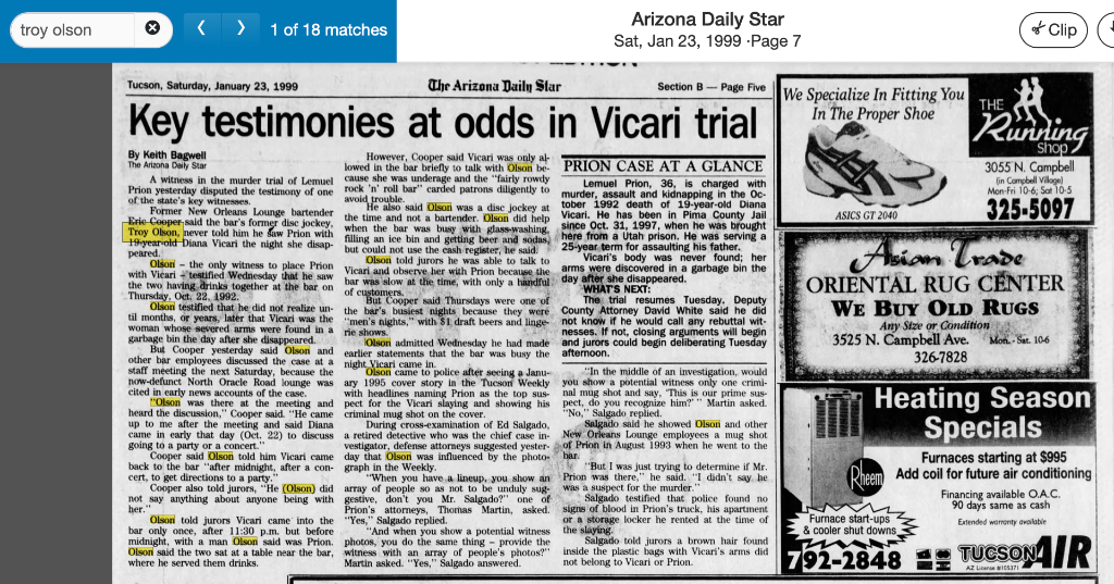 For the longest time, county prosecutors and the Vicari family believed Lemuel Prion killed and dismembered Diana. Diana's car was found just days later near La Cholla and Osa St., just blocks away from where Prion lived at the time. In 1999, he was convicted and sentenced to death for the grisly crime.