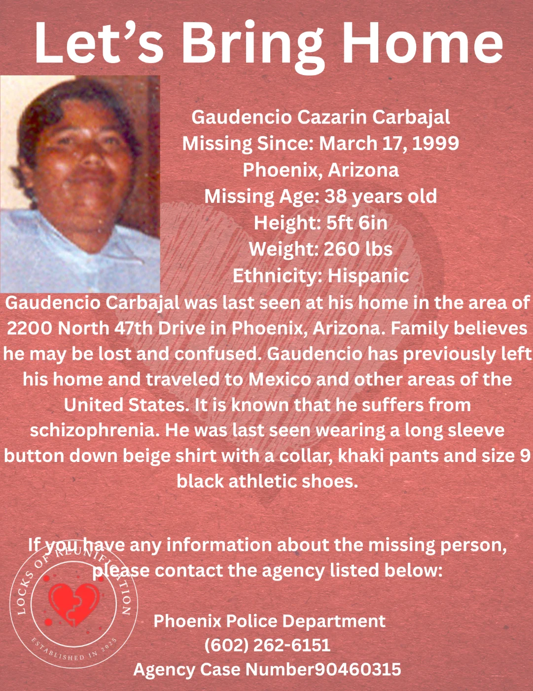 View NamUs missing person case MP462 for Gaudencio Cazarin Carbajal missing from Phoenix, Arizona. Date of last contact: Mar 17, 1999. NCMEC case number: --.