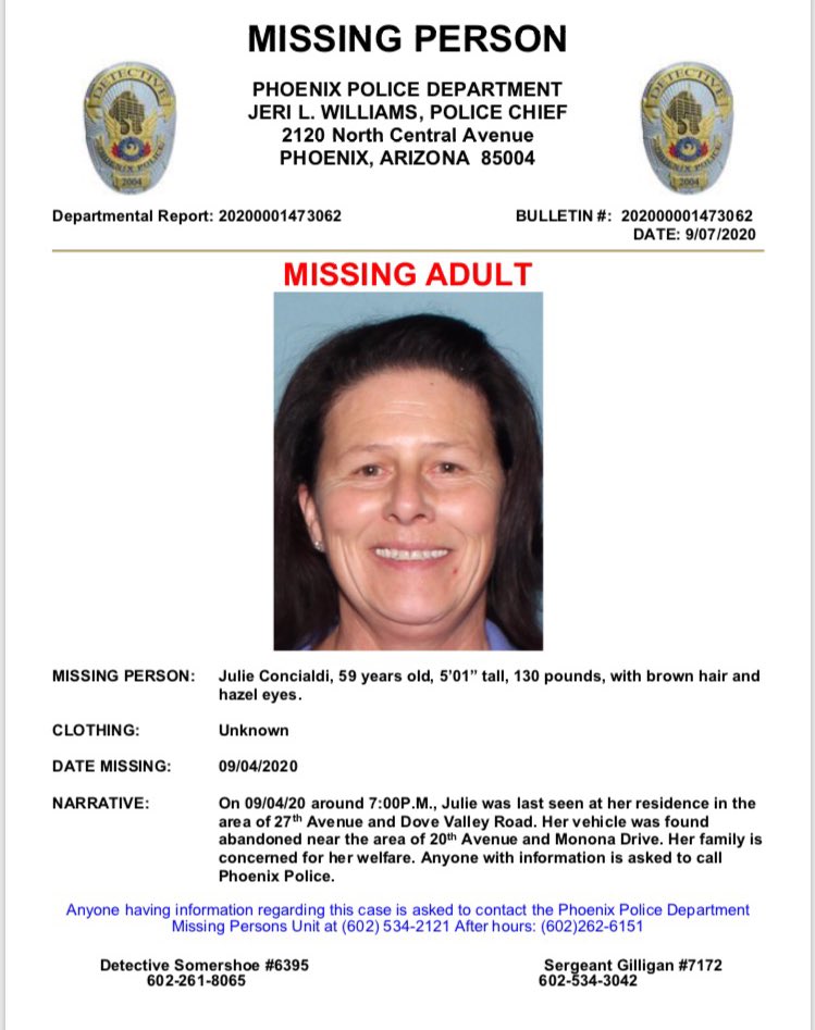 Julie Concialdi, 59, was last seen at her Phoenix home in the area of 27th Avenue and Dove Valley Road around 7 p.m. on Friday, Sept. 4.