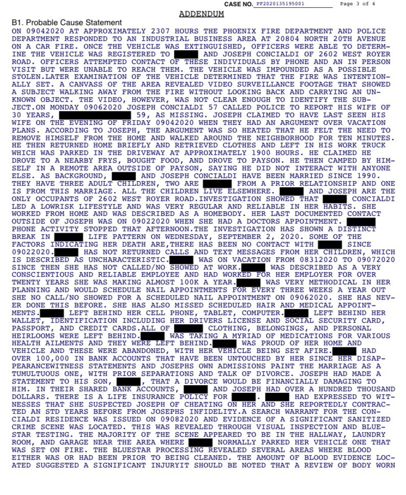 PC says Joseph called police on 9/6, 2 days after Julie’s truck was found on fire. Video surveillance shows person walking away from fire without looking back, carrying unknown object. Joseph reported his Julie missing & spoke of a heated argument that led him to leave on 9/4.