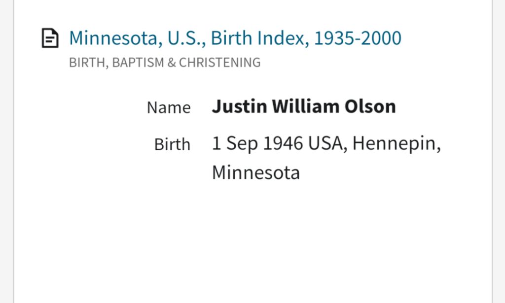 There is a Justin William Olson born in 1946 in MN.
