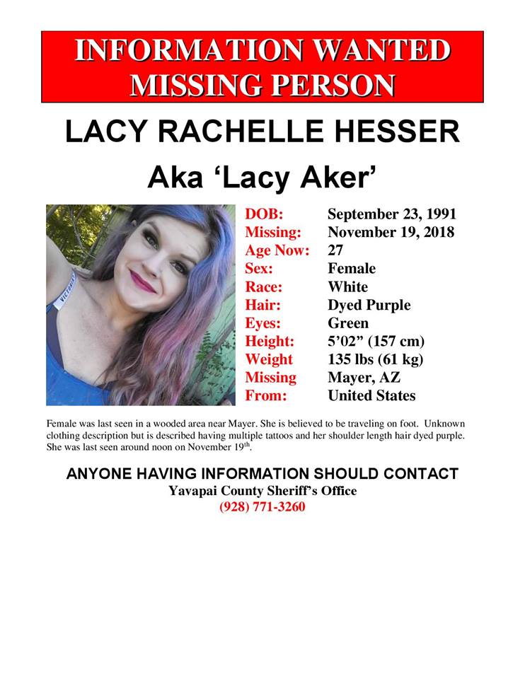 Lacy Rachelle Hesser, aka Lacy Aker, is believed to be traveling on foot. She is 5-foot-2, 135 pounds with green eyes. Her shoulder-length hair is dyed purple, and she has multiple tattoos, according to authorities.