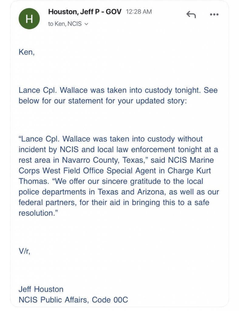 Update: NCIS spokesman has just notified me that “missing Marine” Job Wallace has been taken into custody in Texas