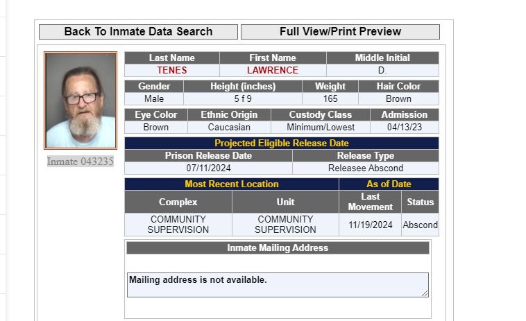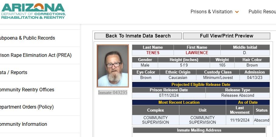 He is currently an official Abscondee from Release. He was released from jail in July 2024, and has not complied with the terms of his supervised probation. He was listed as an abscondee in November. State Department of Corrections Website is (and a screenshot of his info is attached) Inmate Data Search | Arizona Department of Corrections, Rehabilitation & Reentry