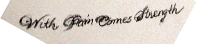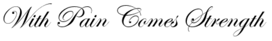 Monochromatic cursive tattoo of "With Pain Comes Strength" on left upper chest