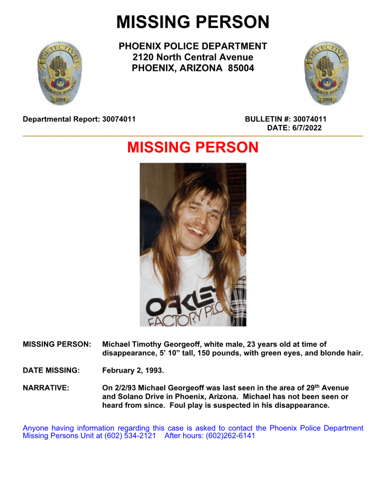 Circumstances of Disappearance On 02/02/93 at approximately 6:00 P.M. Michael Georgeoff was last seen in the area of 29th Avenue and Solano Drive in Phoenix, Arizona, when he was dropped off in front of his home by a friend. Michael has not been seen or heard from since.