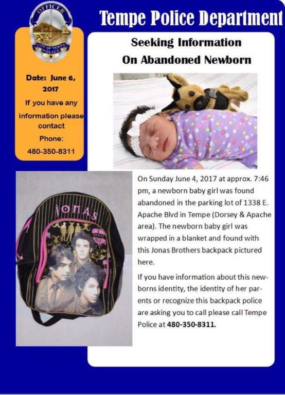 A pedestrian was walking through the parking lot of the Food City grocery store, 1338 E. Apache Blvd., around 7:45 p.m. and found the baby wrapped in a blanket inside a backpack, which was placed in a shopping cart, Tempe police said Monday.