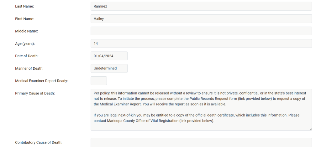 I am thinking perhaps drugs, question being did she overdose or did someone overdose her, I just cannot get my head wrapped around how a 14 year old girl is found on the side of the road and they refer to her as a homicide victim, but never anything else. I was quite surprised to see a change on the report today. I think of 14 as 8th grade or a freshman, young, so very young.Thank you @formerlyme……Manner of Death - Undetermined