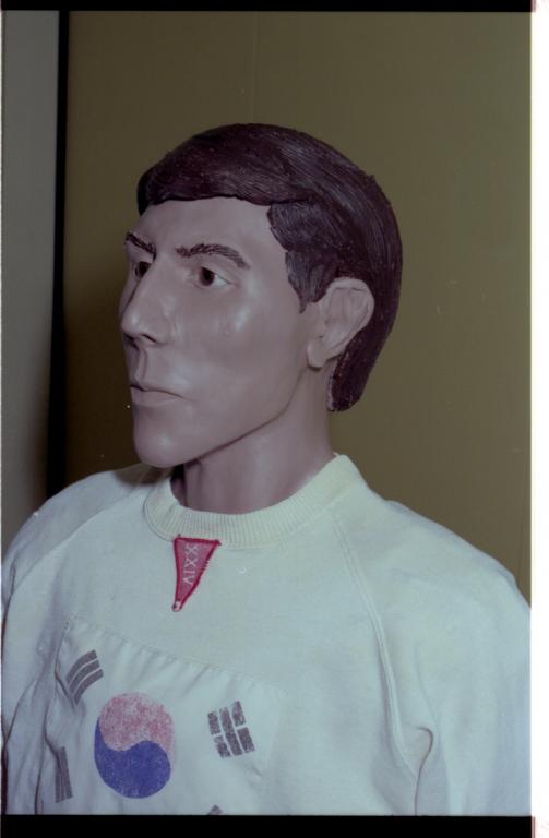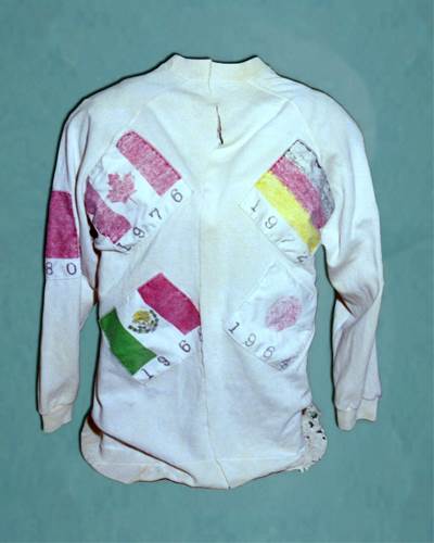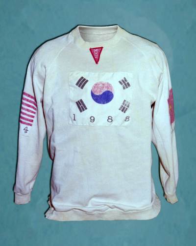 Clothing: Blue tank top with Colorado University Boulder on the front, white sweatshirt with the 1988 Olympic logo, black pants, and white tennis shoes with black laces.