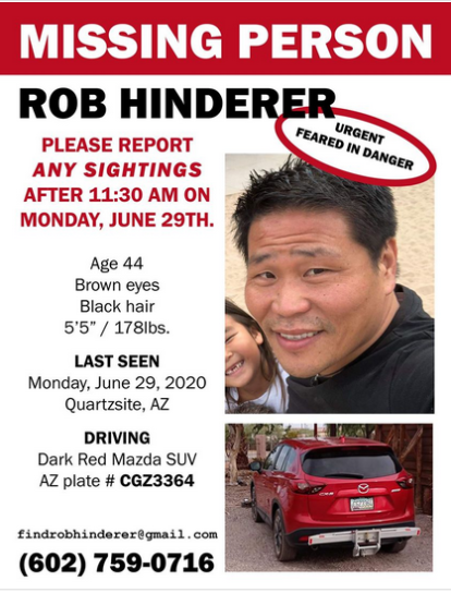 Rob Hinderer was last seen around 11:30 AM on Monday, June 29 leaving an Airbnb in Quartzsite, Arizona. He might also be in the Phoenix area. He drives a red Mazda SUV. He is a 44-yr-old Asian man, 5'5" tall and around 178 pounds. If you have seen him or have ANY information about his whereabouts, please call ‪(602) 759-0716‬ or email [email protected].