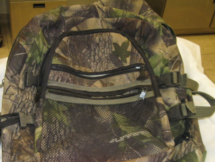 brown belt with white metal buckle, green camoflauge backpack, red strap