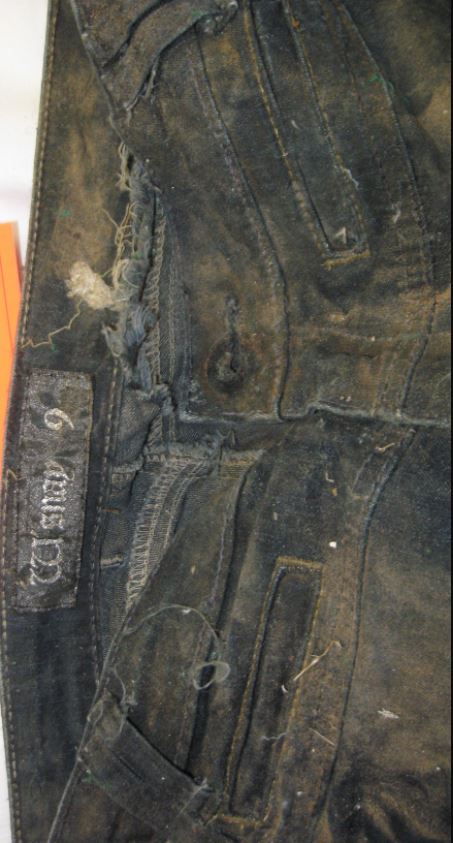 Part of a green shirt, 1 bra, 1 pair of blue denim pants with the label "W SNAY 9," 1 camisole