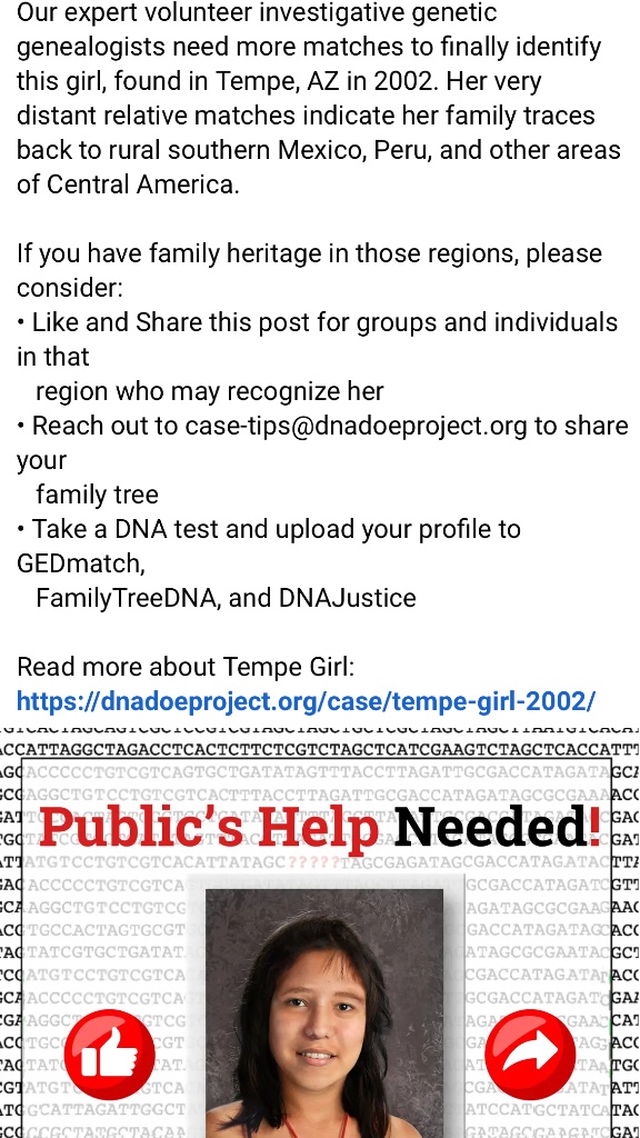 Additionally with DNADoeProject previously mentioning both Mexican and Peruvian descent I've believed she was likely born in this country. Though when you read into it most individuals of Peruvian descent live on the East Coast. The lack of reporting from relatives doesn't surprise me as often immigrants are far less likely to report missing persons and the like and overall can be more distrusting of police. Additionally, sometimes not knowing where to go. Which might be why this Doe doesn't have a missing persons file on record to compare to.