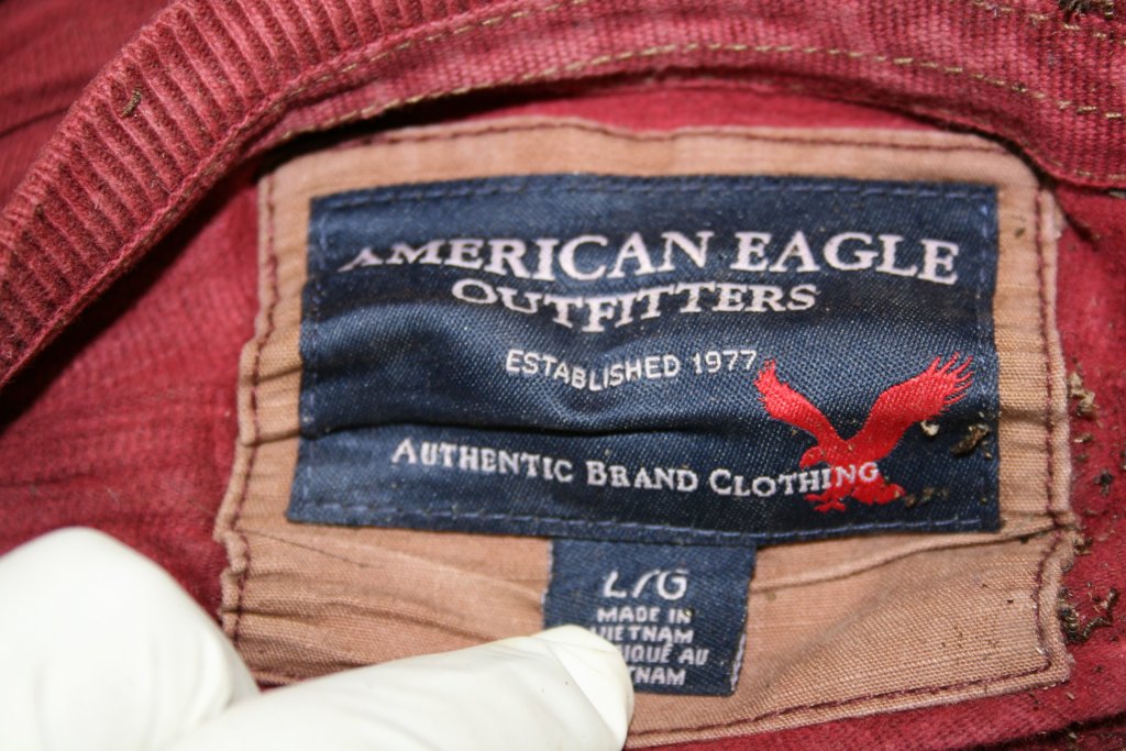 Clothing (Near the Body): "American Eagle" brand blue jeans size 32 x 32 with a brown leather belt, "Old Navy" brand underwear (unknown size), blue nylon gym type shorts (unknown brand and size), "American Eagle Outfitters" brand red shirt with a few botton near the neck, size large
