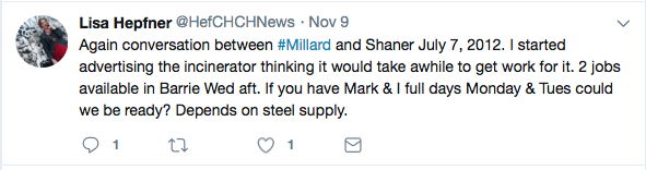 Again conversation between #Millard and Shaner July 7, 2012. I started advertising the incinerator thinking it would take awhile to get work for it. 2 jobs available in Barrie Wed aft. If you have Mark & I full days Monday & Tues could we be ready? Depends on steel supply."