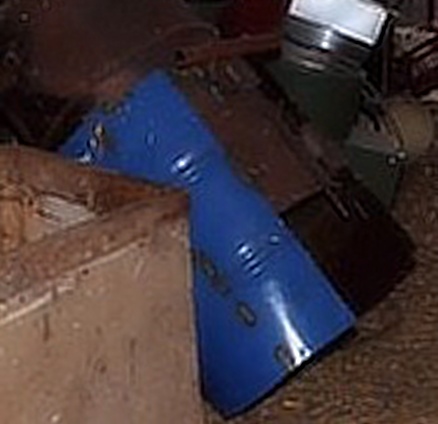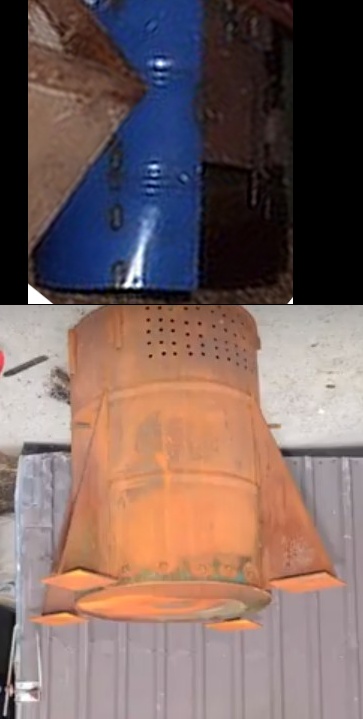 After taking a careful second look, I wonder if it was a last attempt at making it work? The condition of the blue drum tells me it was never subjected to heat. When you look carefully at how the blue drum was attached , it may have been a damper of sorts to adjust "ingress" air flow, and/or cut down on sparks and large hot cinders. It does look like the two pieces still fit together, but the blue drum would extend over the holes in the bottom drum with the landing gear. The bottom drum does not have holes all around, and would suggest the pipes welded on the top part could be used to rotate the top drum from the bottom drum to adjust the damping. MOO