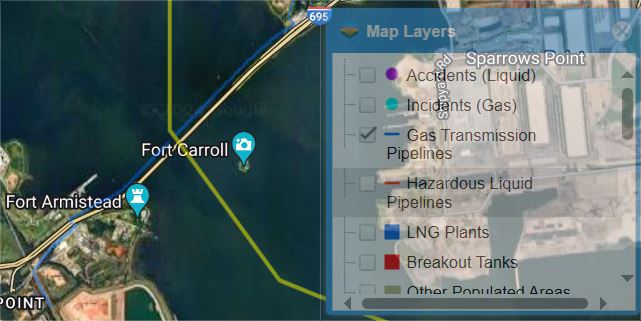 A pipeline safety expert from PHMSA confirmed concerns about a particular pipeline. They informed us, off the record, that the operator was notified and the pipeline has been isolated and depressurized. PHMSA records indicate that the pipeline, which carries natural gas under high pressure, is owned by Baltimore Gas And Electric (BGE). It remains unclear when BGE was alerted and when the pipeline was shut down.