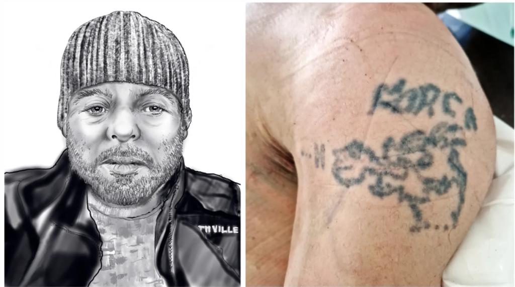 The man is between 30 and 50 years old. He is 1m77 tall and of normal build. He has a shaved head, a dark brown beard and moustache and incomplete teeth. He has a tattoo on his left biceps with the inscription "FORCA" or "MORCA" and a drawing of a dragon.