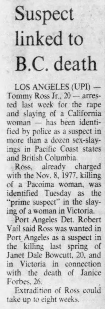 In 1977 my grandmother was murdered in Los Angeles & found by 3 of her 4 children when they came home from school, one of which was my father whom was only 6 years old. After searching for information for years, we finally found out that a man that had been arrested & charged with her murder has been serving in a Canadian Prison for another murder & is wanted all over the westcoast for other murders. This man was released from prison and is now a free man in California while Clallam county tries to appeal their ability to put him on trial for the murder of a woman in Port Angeles, WA.