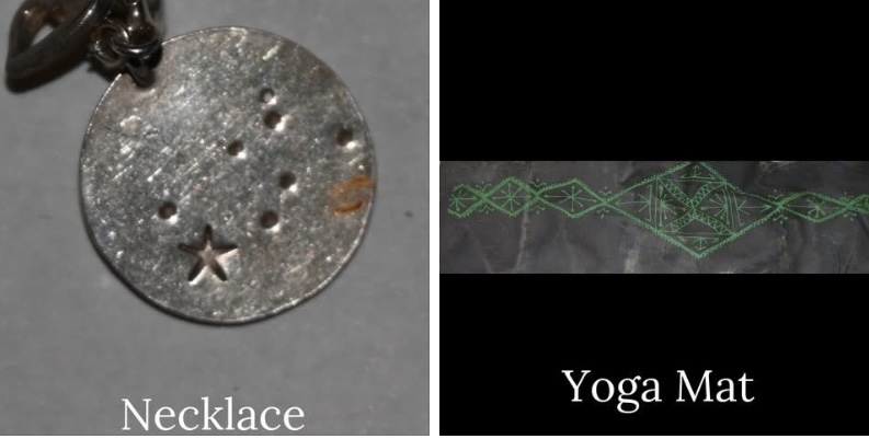 Female had a yoga mat and a necklace (no desc). A recon photo of her tattoos are below. A koi fish on the back of her shoulder blade and a large rose tattoo on her ribs extending from chest to hip.