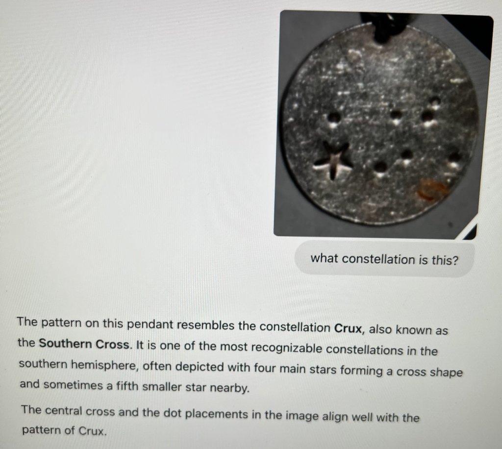Also, according to ChatGPT, see the following analysis on the necklace. It most resembles the constellation Crux, aka the Southern Cross as described below.