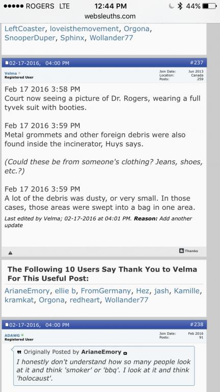 Rogers also testified about the detailed grid search of two “burn sites” on the farm. A tent was erected around the two circular sites — which reeked of gasoline — as a team of anthropology students combed the charred sections of corn field looking for evidence.