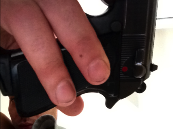 Looking a gun with Smich's two fingers in front and his face in background. How heavy was that gun? "Um, I don't recall."
