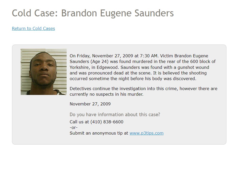 Hello, My name is Nacho, I am attempting to post this thread to bring light to this cold case. On November 26, 2009, Brandon Jerome Saunders was murdered in Edgewood, Maryland. His body was found the next morning, 11/27/2009 (thanksgiving) at 7:30 AM by someone taking their dog outside to use the bathroom. Brandon was a young man who had a traumatic childhood and was trying to learn to overcome. At a young age, he joined a gang looking for brotherhood and family. Brandon expressed to me many times that he no longer wanted to live that life but he had no clue how to get out due to the oath he took, "blood in, blood out". Brandon and I had a plan to move to Florida and start a new life in February of 2010. Sadly, Brandon never made it to that date. There are a lot of suspicious circumstances surrounding his death. I was being threatened constantly for cooperating with police. I attended his viewing when fellow gang members showed up and began to do hand gestures and other things trying to intimidate me. It worked. I did not attend his funeral due to fear of my own life and the life of my children. It got so bad, that I hopped on a bus to Florida in the middle of the night and started my life over. This case was labeled by police as gang related and therefore was never a priority and still remains cold to this day. Apparently, people were too afraid to talk to police due to retaliation. I knew Brandon on an intimate level and he was a genuinely good person trying to escape that lifestyle. He was and is a very special person and he deserves for his story to be heard and his case be solved so that Justice can ensue. I have some information and theories on what really happened to him and would like help in solving this case. It has affected me and my children personally and still affects us to this day as this was a devastating loss to us. I know the photo says Eugene was his middle name, but this is incorrect. His name was Brandon Jerome Saunders and he is greatly missed. God bless.