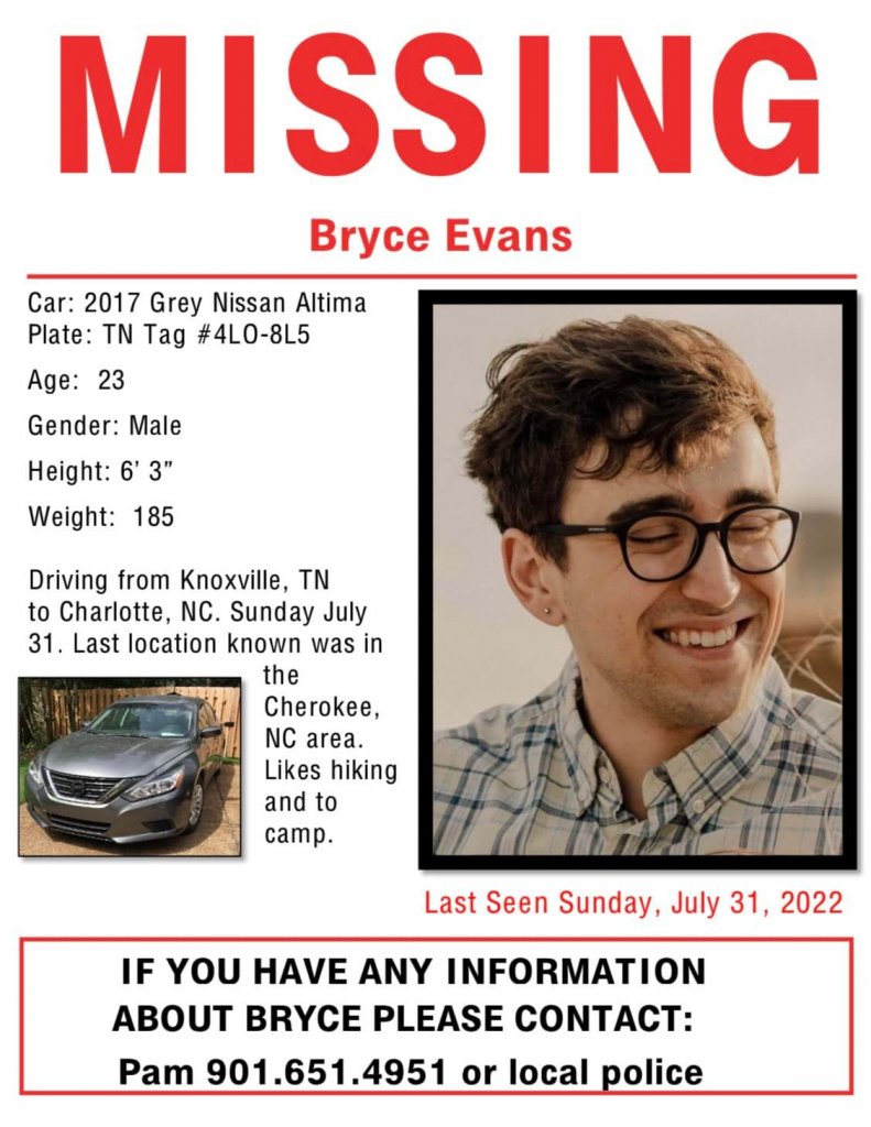 "Late yesterday afternoon/early evening, Bryce’s car was found at a hiking trailhead in a very remote part of the Great Smoky Mountain National Park. Pam and I followed local police out there, but it took an hour and a half to travel 22 miles. Bryce is an Eagle Scout and a member of the TN National Guard, we know the training he received from both will help him in this remote area.I can’t find it on msm yet, but his sister posted an hour ago that last night, two women went down the wrong road and found his car at a trailhead in a remote area of Great Smoky Mountains National Park, in an area of no cell service. A brief search was conducted then but called off due to darkness. It was set to resume this morning at seven.
