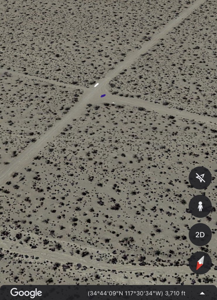 The stretch between Lone Pine and Adelanto, or Victorville is really not pretty desert. Especially between Kramer Junction and Adelanto is flat featureless dry scrub without trees. I think there is one old sad Joshua Tree, but not even anything like the flats with many Joshua Trees slightly farther north. The sky is never blue, it is always dirty and hazy, either from dust or from the relentless heat. It is an area I never want to have car problems in and always drive during daylight, avoiding being on that road in the dark.