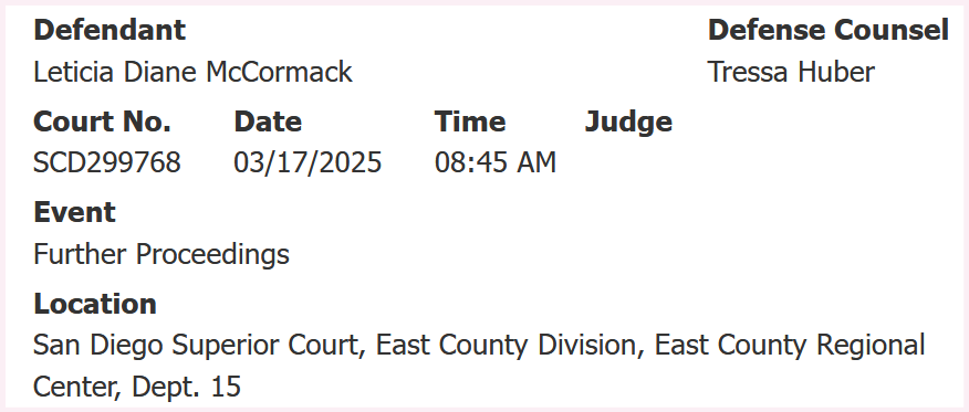 2/26/25 Update: The Grand jury handed up an indictment charging the child’s adoptive mother & adoptive grandparents with murder & a special circumstances allegation of torture. That allegation makes the punishment either life in prison without parole or execution. Leticia McCormack and her parents, Stanley & Adella Tom, had already been charged with murder for the girl’s 2022 death but not the special circumstance allegation. They were slated to have a preliminary hearing in El Cajon on Wednesday, but that hearing was supplanted by the grand jury indictment the prosecutors secured last fall. Wednesday’s hearing was to set a future court date for further proceedings. The grand jury indictment lays out 641 overt acts by McCormack, her parents or her husband, Brian McCormack, that prosecutors said were committed in furtherance of an alleged conspiracy, including routinely depriving the sisters of food, water & bathroom trips. Some of the allegations arise from text messages to each other. Next for all further proceedings hearing on 3/17/25 @ 8:45am.