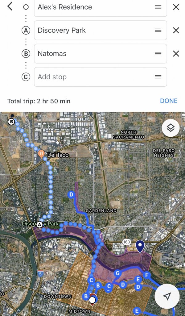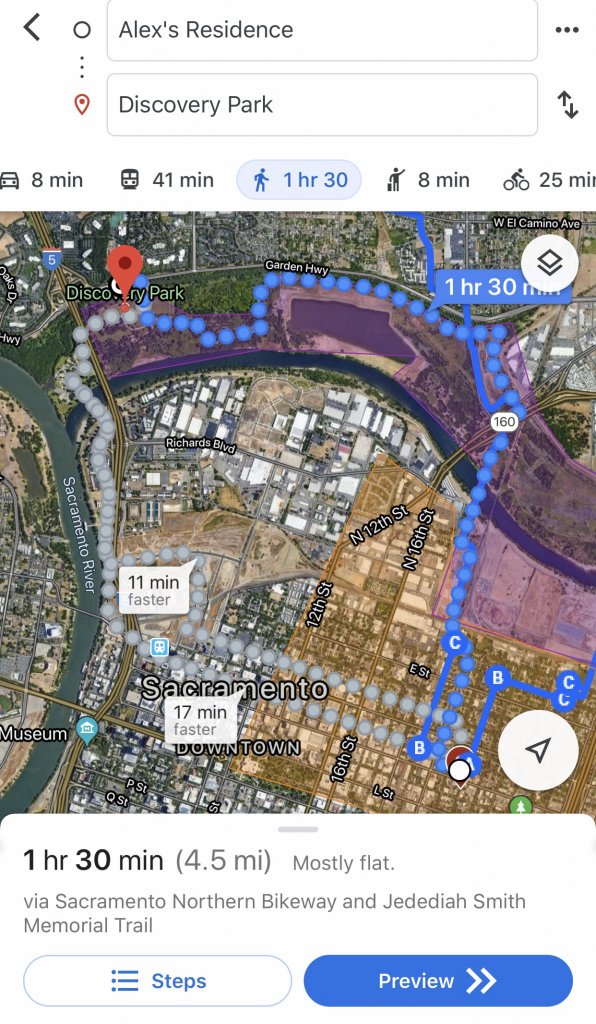 It appears to be about an 1.5-hour walk or 4.5 walking miles from Alex’s residence to Discovery Park: