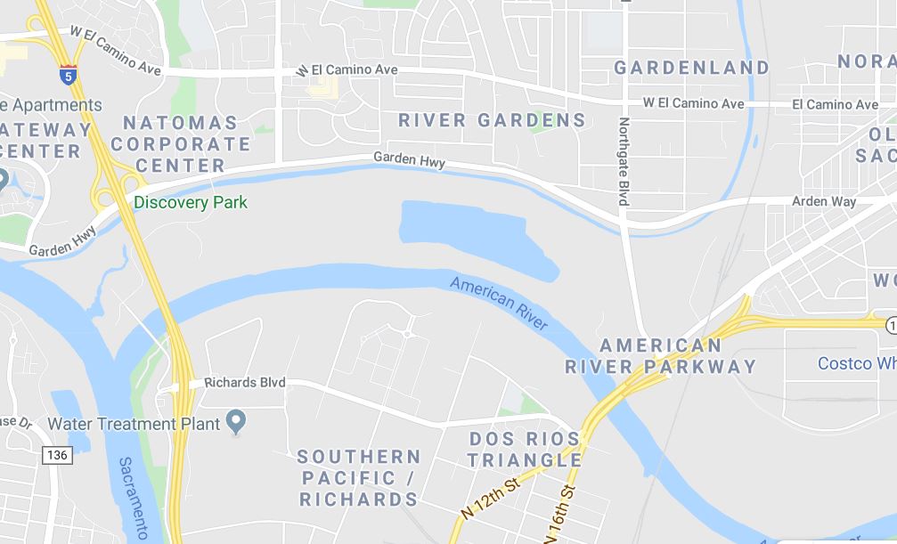 Discovery Park is about 2 miles west of the Arden/Northgate area. If the map I copied works, the Arden/Northgate area of the river is basically where it says "American River Parkway" and you can see Discovery Park to the left.