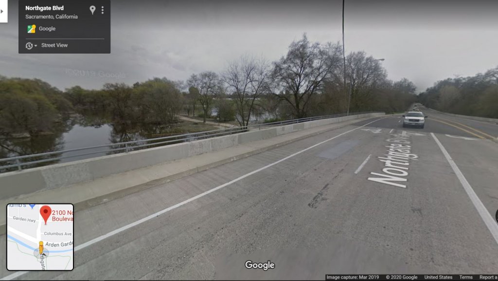 When I say creek, I mean the creek that follows Arden Garden Connector, which he would have to cross either on foot or via Northgate to get to the Natomas area. Here is the picture again: