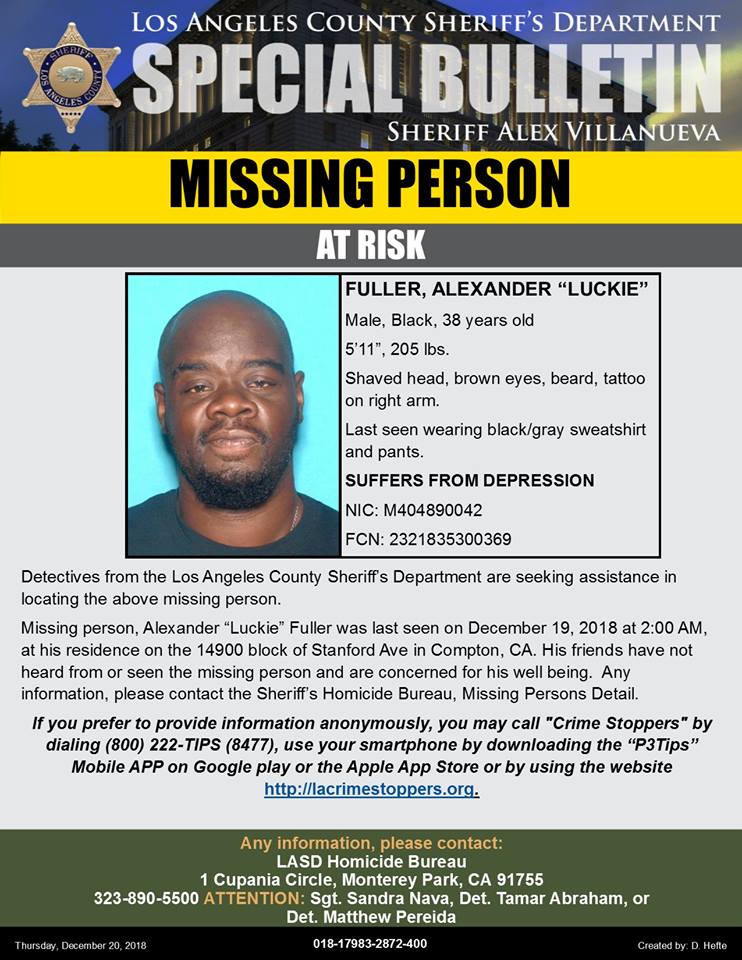 Los Angeles County Sheriff’s Department’s detectives are asking for the public’s help in locating At-Risk Missing Alexander “Luckie” Fuller. He is a 38-year-old who was last at his residence on the 14900 block of Stanford Avenue, Compton, on Wednesday, December 19, 2018, at approximately, 2:00 AM.