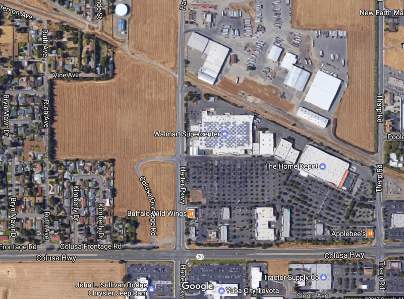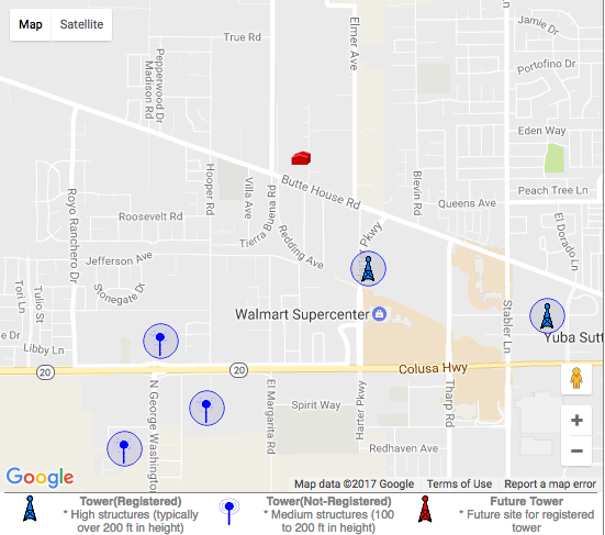 Antenna Towers in the area. One is owned by Verizon wireless (Walmart side of HWY 20) which was most likely the one that the cell phone pinged and the ones above Walmart is D&D Communications.