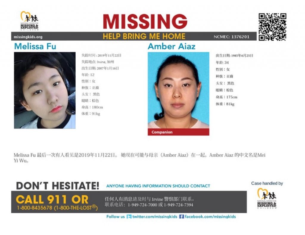 Amber Aiaz, AKA Mei Yi Wu, 34, and her daughter, Melissa Fu, 12, were last seen on Friday, Nov. 22, at their residence located in the area of Michelson and University in Irvine.