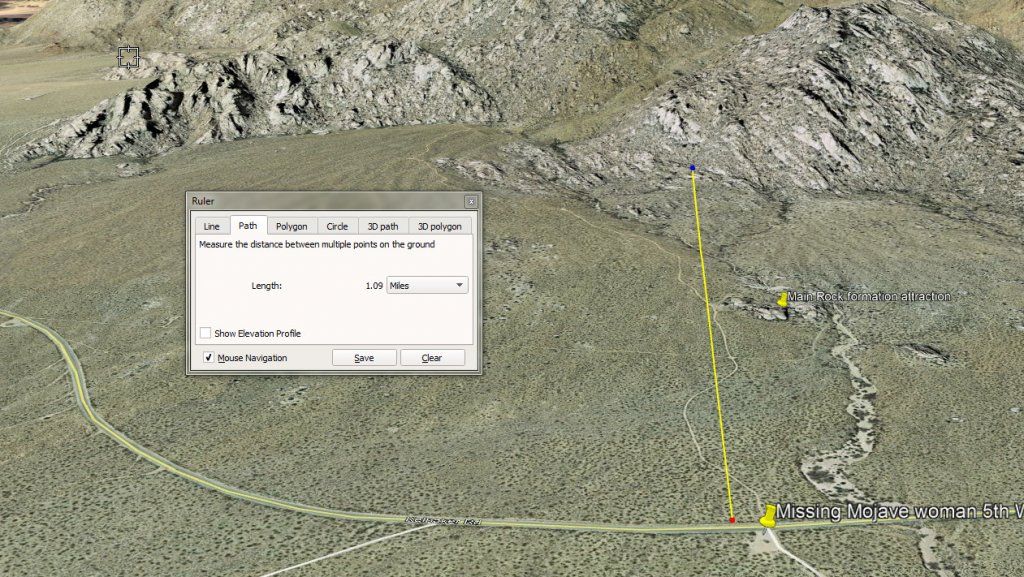 My main concern was also the shelter theory, that she may have gotten off the trail to seek shelter in the dense thickets, rocks or if RT story is incorrect, worse, in all kinds of other rock formations further south, or west into the Granite Mountains. It's about a mile from the trailer turnout as the crow flies to where you hit the wall of the Granite Mountains. Unless they were climbers, they would not want to attempt up there. They could have followed the dirt road that skirts South around the foothills of these Granite Mountains, but all those trails were heavily driven by SAR and Sheriff vehicles. That's probably what they did initially, just cover as much ground as possible in as fast a time. I also saw lots of quad 4wheeler tracks running straight through the vegetation, so they would have done that according to their grid search likely. So I don't think her going way beyond the search grid is plausible, with the few facts that we got from RT. Robert is going to need to provide more detailed timeline and an exact account of where they went and what they did and show the pictures he took in order to help the volunteer searchers.
